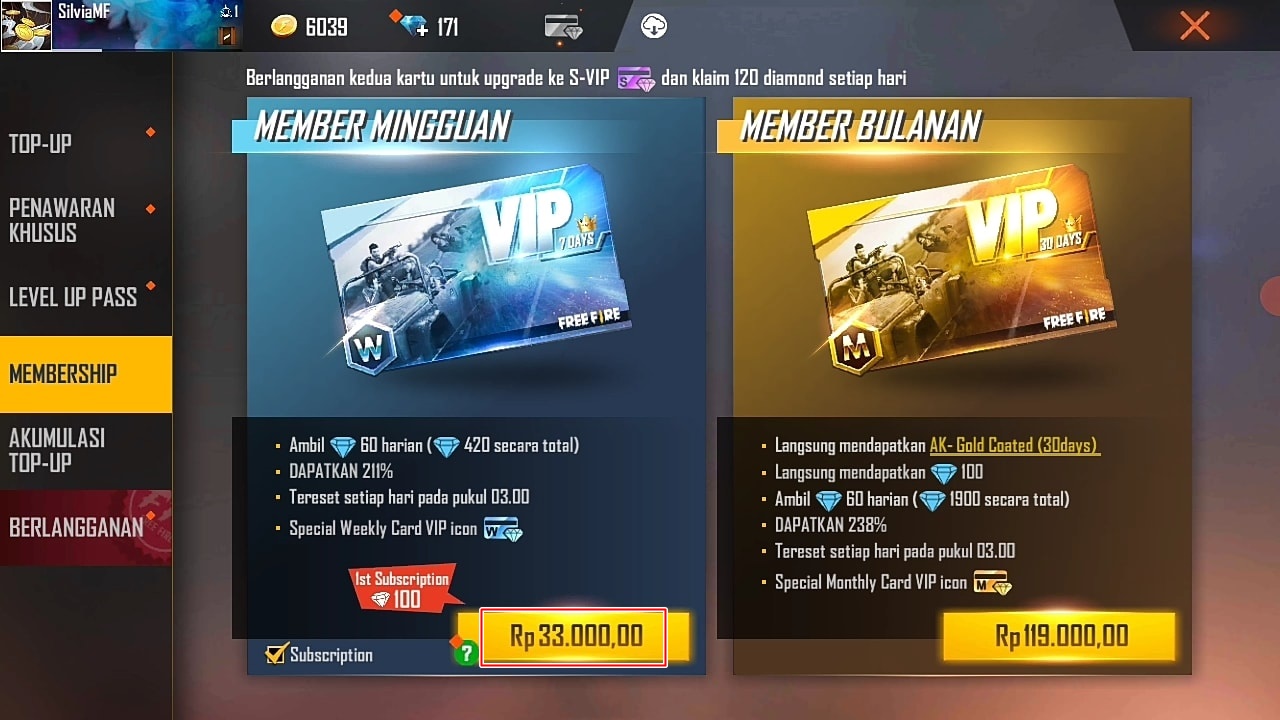 In addition to buying diamonds in the Free Fire game, you can also buy a membership in the Free Fire game. There are 2 options for buying a Free Fire membership, namely the weekly and monthly ones. The difference lies in the prizes you get and the price, for a monthly membership the price is more expensive.