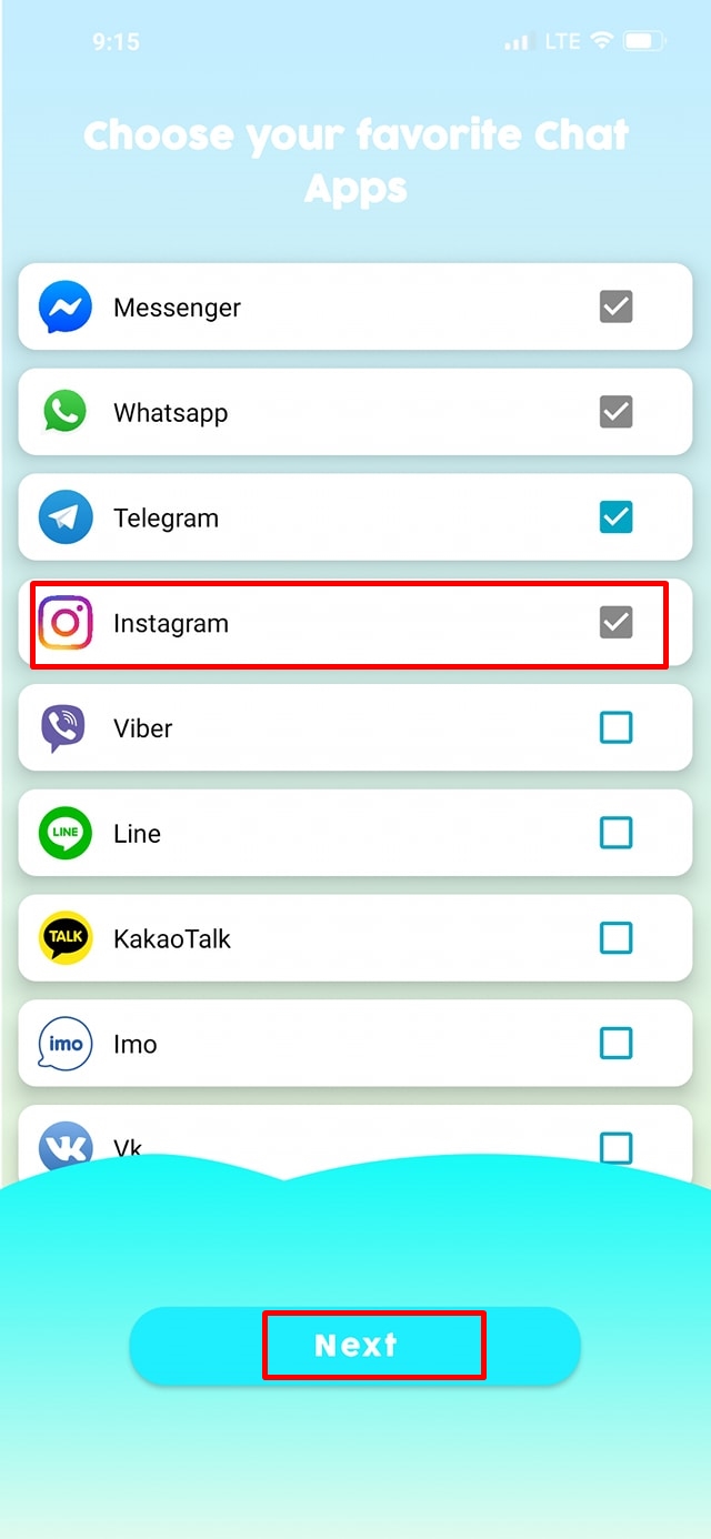 3. In the Choose your favorite chat Apps section, make sure Instagram is checked, tap Next.
