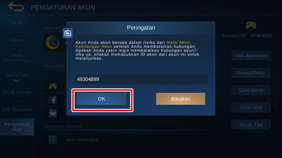 6. There will be a warning your account is at risk then enter your account id which will be unbind, tap Ok